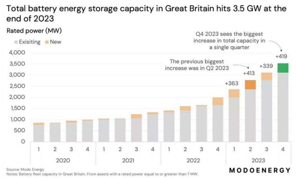 中國(guó)儲(chǔ)能網(wǎng)訊:能源研究咨詢(xún)機(jī)構(gòu)Modo Energy公司日前證實(shí),英國(guó)在2023年第四季度開(kāi)通運(yùn)營(yíng)了420 MW電池儲(chǔ)能系統(tǒng)。其裝機(jī)容量與上一季度相比增長(zhǎng)了13%,成為英國(guó)有史以來(lái)運(yùn)營(yíng)電池儲(chǔ)能系統(tǒng)最高季度。而之前的季度紀(jì)錄是在2023年第二季度創(chuàng)造的,當(dāng)時(shí)開(kāi)通運(yùn)營(yíng)了413MW電池儲(chǔ)能系統(tǒng)。