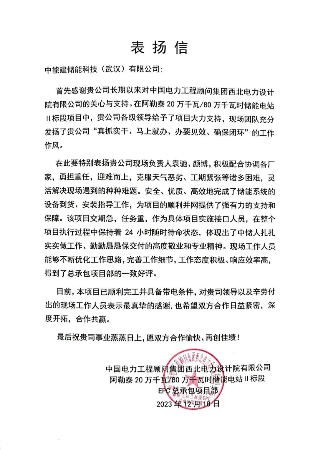 2023年10月20日,中儲科技員工率先到達新疆阿勒泰項目現(xiàn)場,成立現(xiàn)場作業(yè)小組,配合物流接收設(shè)備。面對項目體量大,時間緊,天氣寒冷,交叉作業(yè)多等困難,中儲科技售后團隊科學(xué)規(guī)劃,制定項目調(diào)試與倒送電時間計劃,現(xiàn)場條件電力不足的情況下,租用發(fā)電機組為設(shè)備加溫和提供電源,進行項目并網(wǎng)前的內(nèi)部調(diào)試。在現(xiàn)場調(diào)試時間特別緊的情況下,與多方積極溝通,靠前主動服務(wù),現(xiàn)場員工24小時待命,多名員工輪班安裝、調(diào)試。在售后團隊的保駕護航下,項目如期實現(xiàn)并網(wǎng),得到了業(yè)主與協(xié)同單位稱贊認可。