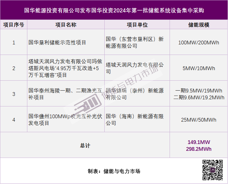 中國儲能網(wǎng)訊:1月29日,國華能源投資有限公司發(fā)布國華投資2024年第一批儲能系統(tǒng)設備集中采購招標公告。共集中采購4個項目149.1MW/298.2MWh儲能系統(tǒng)設備。