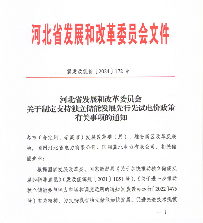 中國(guó)儲(chǔ)能網(wǎng)訊:2024年1月27日,河北省發(fā)展和改革委員會(huì)印發(fā)《關(guān)于制定支持獨(dú)立儲(chǔ)能發(fā)展先行先試電價(jià)政策有關(guān)事項(xiàng)的通知》(簡(jiǎn)稱《通知》)?!锻ㄖ访鞔_,參與競(jìng)爭(zhēng)的獨(dú)立儲(chǔ)能電站容量原則上不低于10萬(wàn)千瓦、滿功率持續(xù)放電時(shí)長(zhǎng)不低于4小時(shí),2024年1月1日前省級(jí)批復(fù)的電網(wǎng)側(cè)獨(dú)立儲(chǔ)能項(xiàng)目可放寬至不低于2小時(shí)。