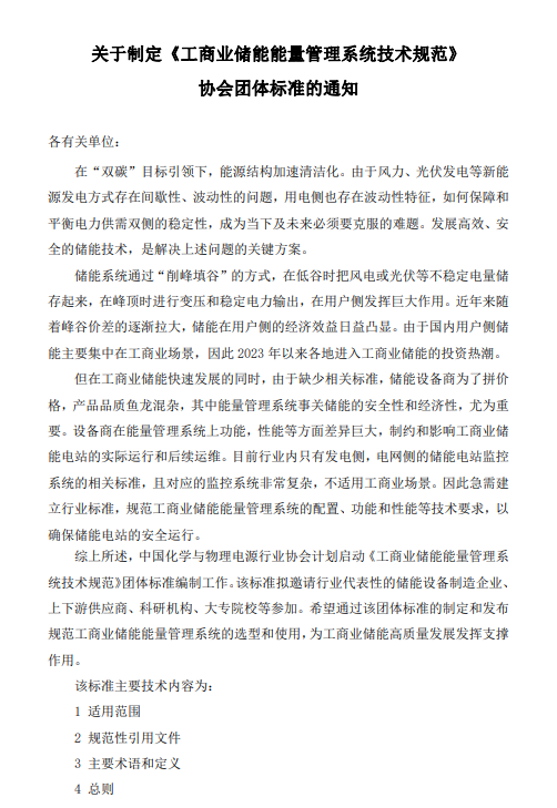 關(guān)于制定《工商業(yè)儲(chǔ)能能量管理系統(tǒng)技術(shù)規(guī)范》協(xié)會(huì)團(tuán)體標(biāo)準(zhǔn)的通知