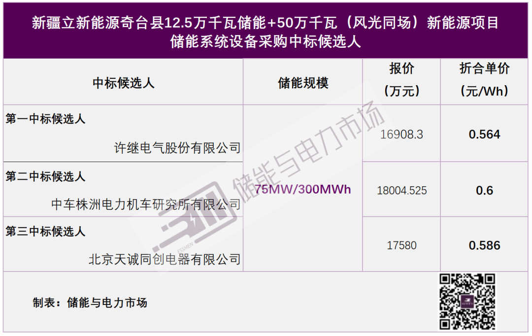中國儲能網(wǎng)訊:2月8日,新疆立新能源奇臺縣12.5萬千瓦儲能+50萬千瓦(風(fēng)光同場)新能源項目儲能系統(tǒng)設(shè)備采購中標(biāo)候選人公示。涉及儲能規(guī)模75MW/300MWh,許繼電氣以單價0.564元/Wh,預(yù)中標(biāo)該項采購。