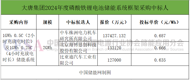2月18日,中國(guó)大唐集團(tuán)有限公司2024年度磷酸鐵鋰電池儲(chǔ)能系統(tǒng)框架采購(gòu)公示中標(biāo)結(jié)果,中車株洲所、海博思創(chuàng)、比亞迪三家企業(yè)中標(biāo),報(bào)價(jià)區(qū)間為0.635-0.687元/Wh。