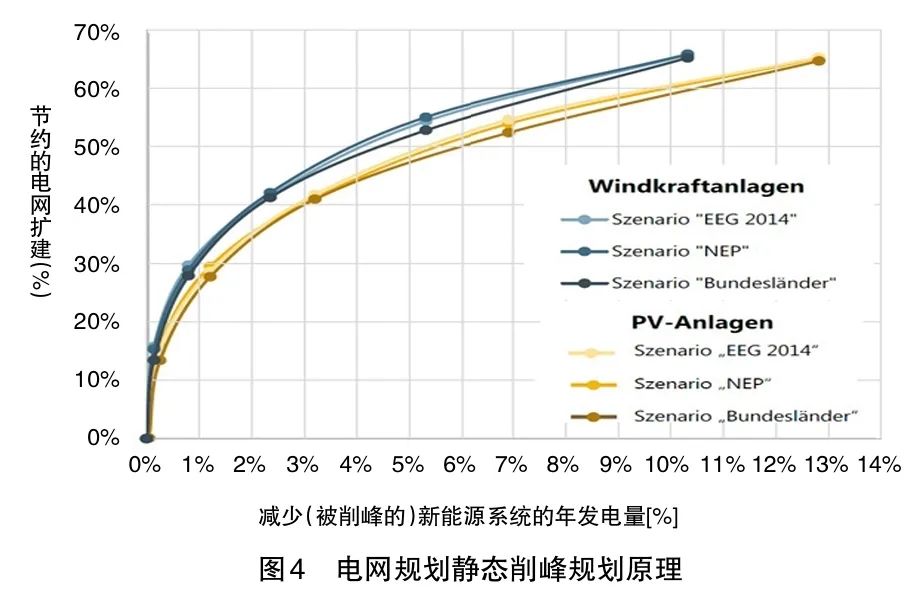鑒于中德兩國配電網(wǎng)的拓撲結(jié)構(gòu)差異,分布式風(fēng)電的比例可能較低,主要面臨光伏發(fā)電的挑戰(zhàn)。因此,進一步深入研究以選擇最佳削峰規(guī)劃(見圖8)是必要的,相關(guān)光伏設(shè)備的額定功率亦需明確。面對能源危機,德國在電力短缺的情況下放寬了適用于小型光伏發(fā)電設(shè)備的削峰規(guī)定。削峰規(guī)劃的研究在德國主要聚焦于中低壓配電網(wǎng),高壓配電網(wǎng)方面的研究相對有限。另外,根據(jù)德國的研究,在缺乏補貼的情況下,化學(xué)電池在配電網(wǎng)削峰規(guī)劃的應(yīng)用上難以實現(xiàn)盈利。事實上,目前所有的電池在電力系統(tǒng)的應(yīng)用都難以靠自身的力量收回投資,其中也包括家用光伏電池在內(nèi)。