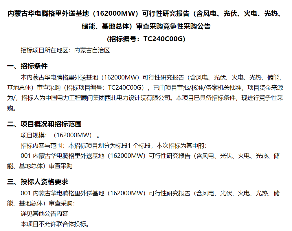 根據(jù)招標(biāo)公告,項(xiàng)目規(guī)模為162GW。本招標(biāo)項(xiàng)目劃分為標(biāo)段1個標(biāo)段,本次招標(biāo)為其中的內(nèi)蒙古華電騰格里外送基地(162000MW)可行性研究報告(含風(fēng)電、光伏、火電、光熱、儲能、基地總體)審查采購。