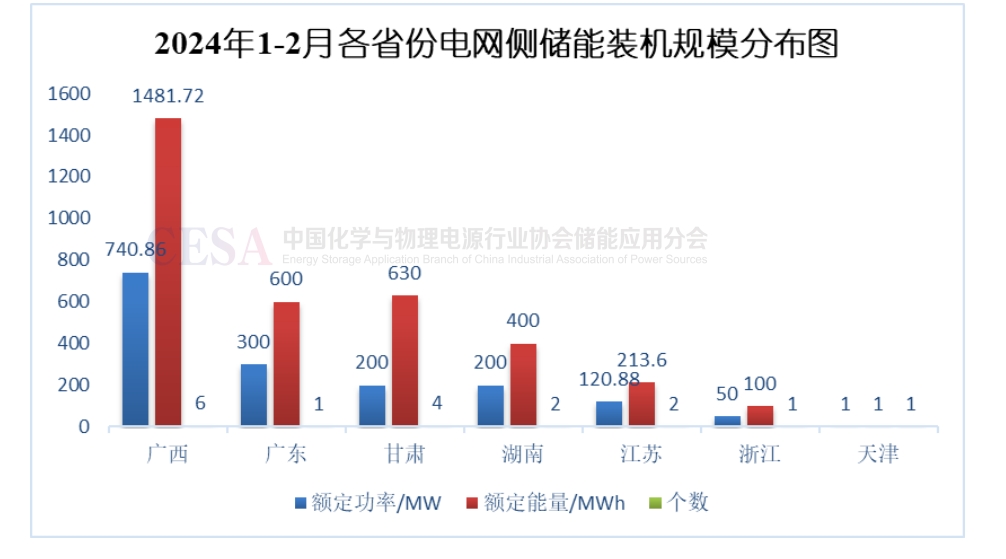 2024年1-2月共新增電網(wǎng)側(cè)新型儲能項目17個,總規(guī)模為1.613GW/3.426GWh。從規(guī)模上來看,新增電網(wǎng)側(cè)儲能項目主要以大型儲能項目為主,共有9個百兆瓦級儲能項目投運,規(guī)模占比達83.5%,電網(wǎng)側(cè)大型獨立共享儲能項目已發(fā)展為主要趨勢。從分布來看,新增項目主要集中于廣西壯族自治區(qū),共有6個電網(wǎng)側(cè)儲能項目投運,總規(guī)模高達740.86MW/1481.72MWh,其中有5個都是百兆瓦級儲能項目,廣西陸屋集中儲能站項目(198.86MW/397.72MWh)、京能興安儲能電站(184MW/368MWh)等儲能項目的投運將增加新能源電力消納量,為廣西經(jīng)濟發(fā)展和能源結(jié)構(gòu)轉(zhuǎn)型構(gòu)建堅實基礎(chǔ)。此外,廣東、甘肅、湖南、江蘇裝機規(guī)模緊隨其后,均達到100MW,其中兩個最大儲能電站:粵港澳大灣區(qū)最大的儲能電站——寶塘儲能站(300MW/600MWh)、南京最大的電化學儲能電站——江蘇南京江北新區(qū)儲能電站(110.88MW/193.6MWh)的投運也將對當?shù)氐碾娋W(wǎng)提供更好的調(diào)節(jié)服務(wù)。
