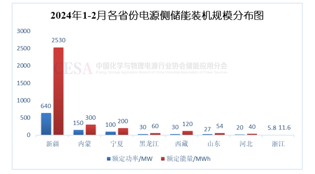 圖2-1-2 2024年1-2月各省份電源側(cè)新型儲能裝機規(guī)模分布圖