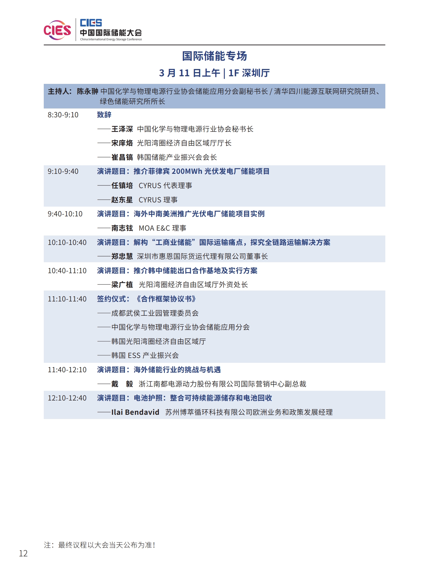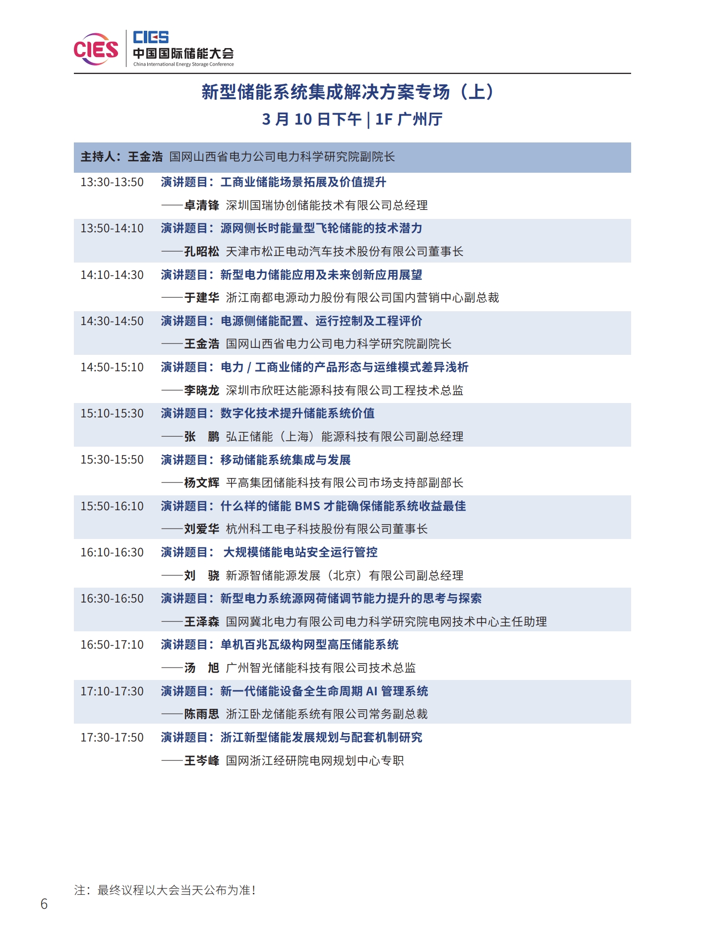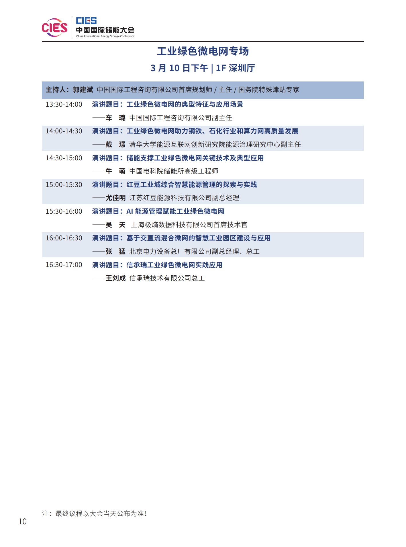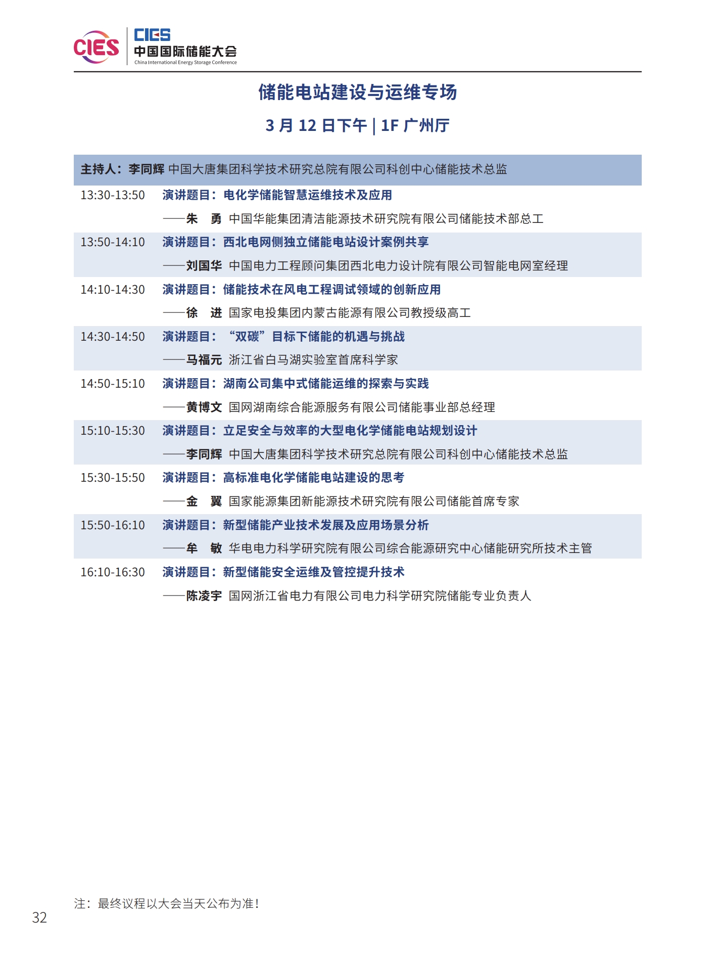 本次大會(huì)將安排有大會(huì)開幕式暨院士/專家主題報(bào)告、工業(yè)綠色微電網(wǎng)、“雙碳”與新型電力系統(tǒng)(上、下)、新型儲(chǔ)能系統(tǒng)集成解決方案(上、中、下)、儲(chǔ)能電站規(guī)劃與設(shè)計(jì)、國(guó)際儲(chǔ)能、儲(chǔ)能檢測(cè)認(rèn)證及標(biāo)準(zhǔn)、儲(chǔ)能溫控系統(tǒng)與安全、長(zhǎng)時(shí)儲(chǔ)能技術(shù)、工商業(yè)儲(chǔ)能、新型儲(chǔ)能資本專場(chǎng)、儲(chǔ)能電站建設(shè)與運(yùn)維、多功能儲(chǔ)能(構(gòu)網(wǎng)型與混合)、新型電力系統(tǒng)與儲(chǔ)能電站建設(shè)、儲(chǔ)能新品發(fā)布(4場(chǎng))等22個(gè)專場(chǎng)論壇。