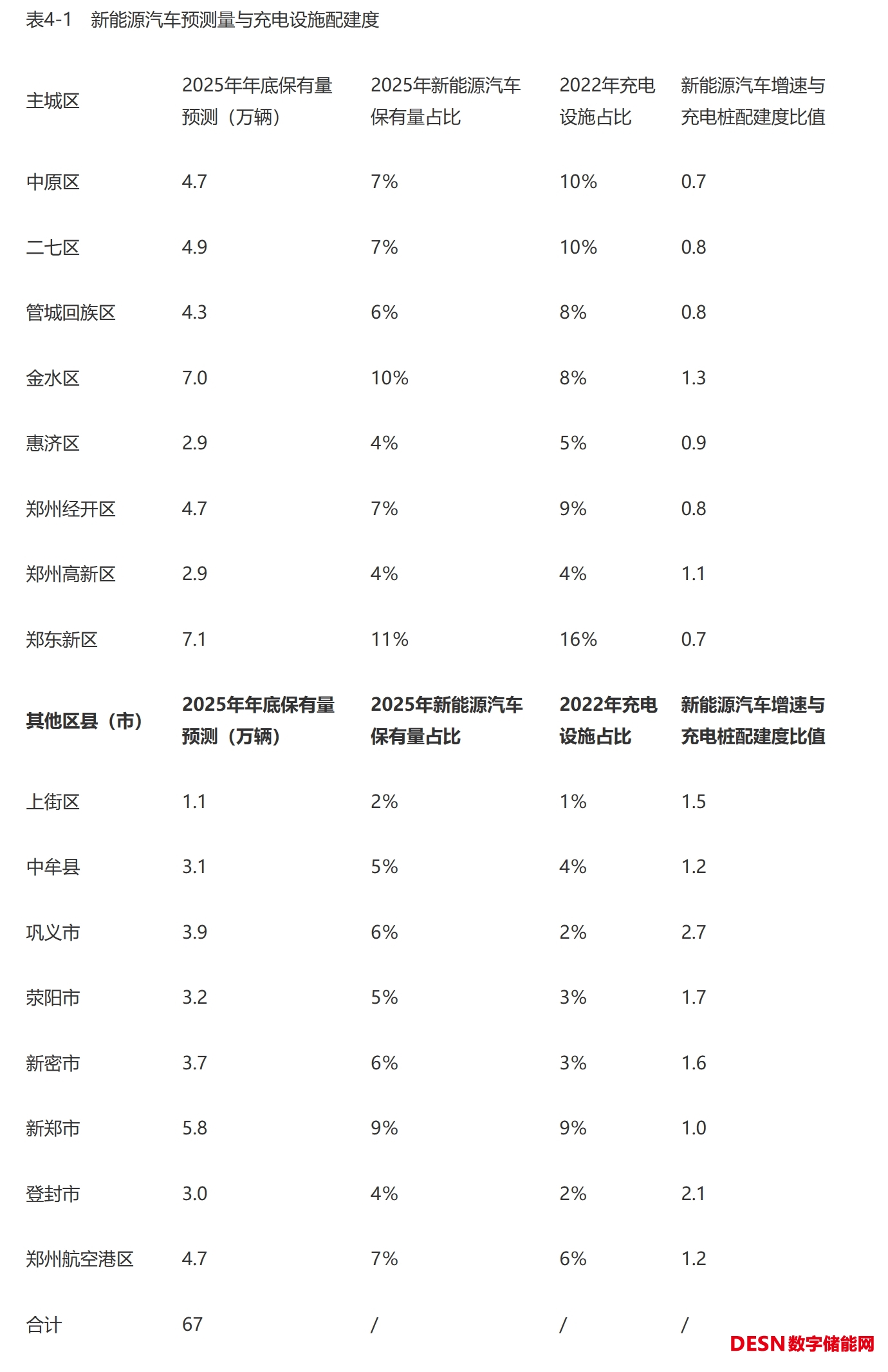 充電設(shè)施配建目標(biāo)需要充分考慮本區(qū)域汽車增長量和本區(qū)域公專用充電設(shè)施配建的成熟度。目前,鄭州市69%的公用充電設(shè)施分布在主城區(qū),中心城區(qū)公用充電設(shè)施建設(shè)密度已達(dá)25個/平方公里。周邊區(qū)縣(市)的充電設(shè)施主要集中在城內(nèi)建成區(qū)域,從充電站服務(wù)半徑考慮,仍有較大的補充空間。根據(jù)表4—1新能源汽車預(yù)測量與充電設(shè)施配建度比值,主城區(qū)的充電設(shè)施建設(shè)速度快于新能源汽車增速。因此,預(yù)測2025年各區(qū)縣(市)新建充電設(shè)施數(shù)量采用2025年新能源車保有量比例進(jìn)行計算更加合理。