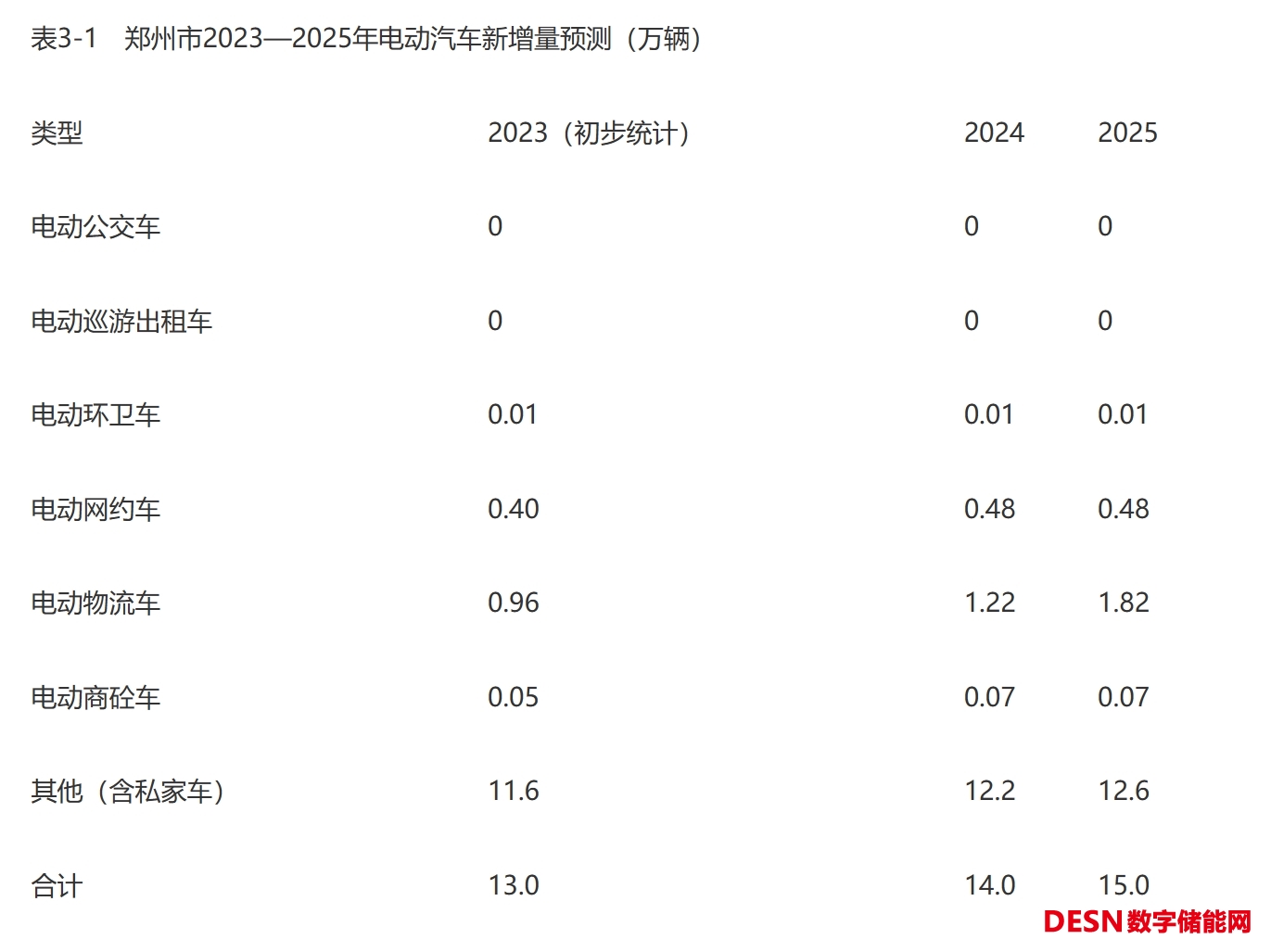 根據(jù)工業(yè)和信息化部等部門《關(guān)于組織開展公共領(lǐng)域車輛全面電動化先行區(qū)試點工作的通知》(工信部聯(lián)通裝函〔2023〕23號),試點領(lǐng)域新增及更新車輛中新能源汽車比例顯著提高,其中城市公交、出租、環(huán)衛(wèi)、郵政快遞、城市物流配送領(lǐng)域力爭達(dá)到80%。本規(guī)劃原則上采用以上標(biāo)準(zhǔn),結(jié)合鄭州市實際調(diào)研情況進(jìn)行合理調(diào)整,2023—2025年各類型新能源汽車增量如下表所示。