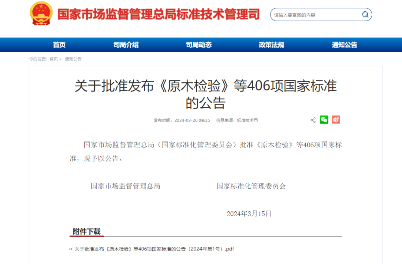 中國儲能網(wǎng)訊:3月15日,國家市場監(jiān)督管理總局(國家標準化管理委員會)批準《原木檢驗》等406項國家標準。