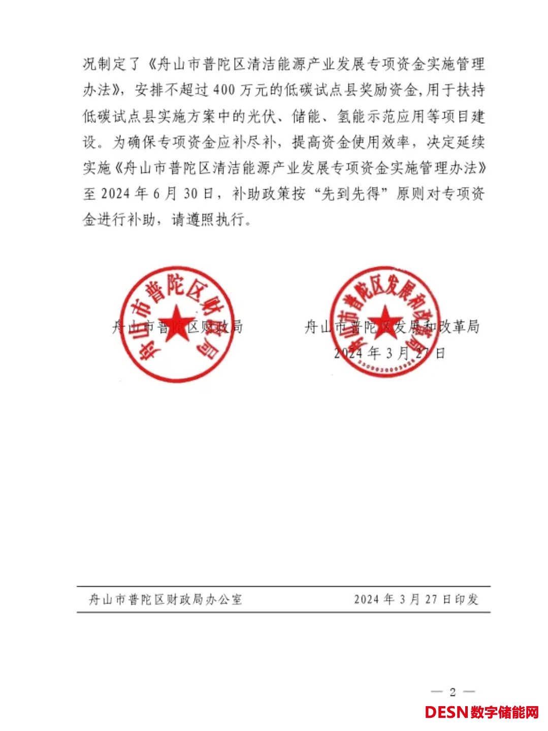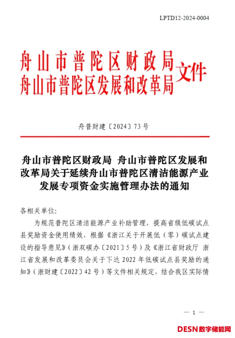 為規(guī)范普陀區(qū)清潔能源產(chǎn)業(yè)補(bǔ)助管理,提高省級(jí)低碳試點(diǎn)縣獎(jiǎng)勵(lì)資金使用績(jī)效,根據(jù)《浙江關(guān)于開(kāi)展低(零)碳試點(diǎn)建設(shè)的指導(dǎo)意見(jiàn)》(浙雙碳辦〔2021〕5號(hào))及《浙江省財(cái)政廳 浙江省發(fā)展和改革委員會(huì)關(guān)于下達(dá)2022年低碳試點(diǎn)縣獎(jiǎng)勵(lì)的通知》(浙財(cái)建〔2022〕42號(hào))等文件相關(guān)規(guī)定,結(jié)合我區(qū)實(shí)際情況制定了《舟山市普陀區(qū)清潔能源產(chǎn)業(yè)發(fā)展專項(xiàng)資金實(shí)施管理辦法》,安排不超過(guò)400萬(wàn)元的低碳試點(diǎn)縣獎(jiǎng)勵(lì)資金,用于扶持低碳試點(diǎn)縣實(shí)施方案中的光伏、儲(chǔ)能、氫能示范應(yīng)用等項(xiàng)目建設(shè)。為確保專項(xiàng)資金應(yīng)補(bǔ)盡補(bǔ),提高資金使用效率,決定延續(xù)實(shí)施《舟山市普陀區(qū)清潔能源產(chǎn)業(yè)發(fā)展專項(xiàng)資金實(shí)施管理辦法》至2024年6月30日,補(bǔ)助政策按“先到先得”原則對(duì)專項(xiàng)資金進(jìn)行補(bǔ)助,請(qǐng)遵照?qǐng)?zhí)行。
