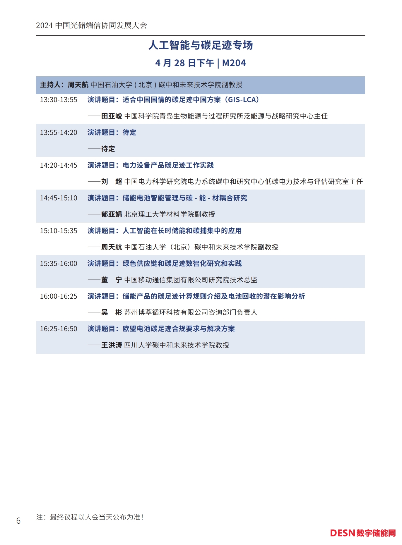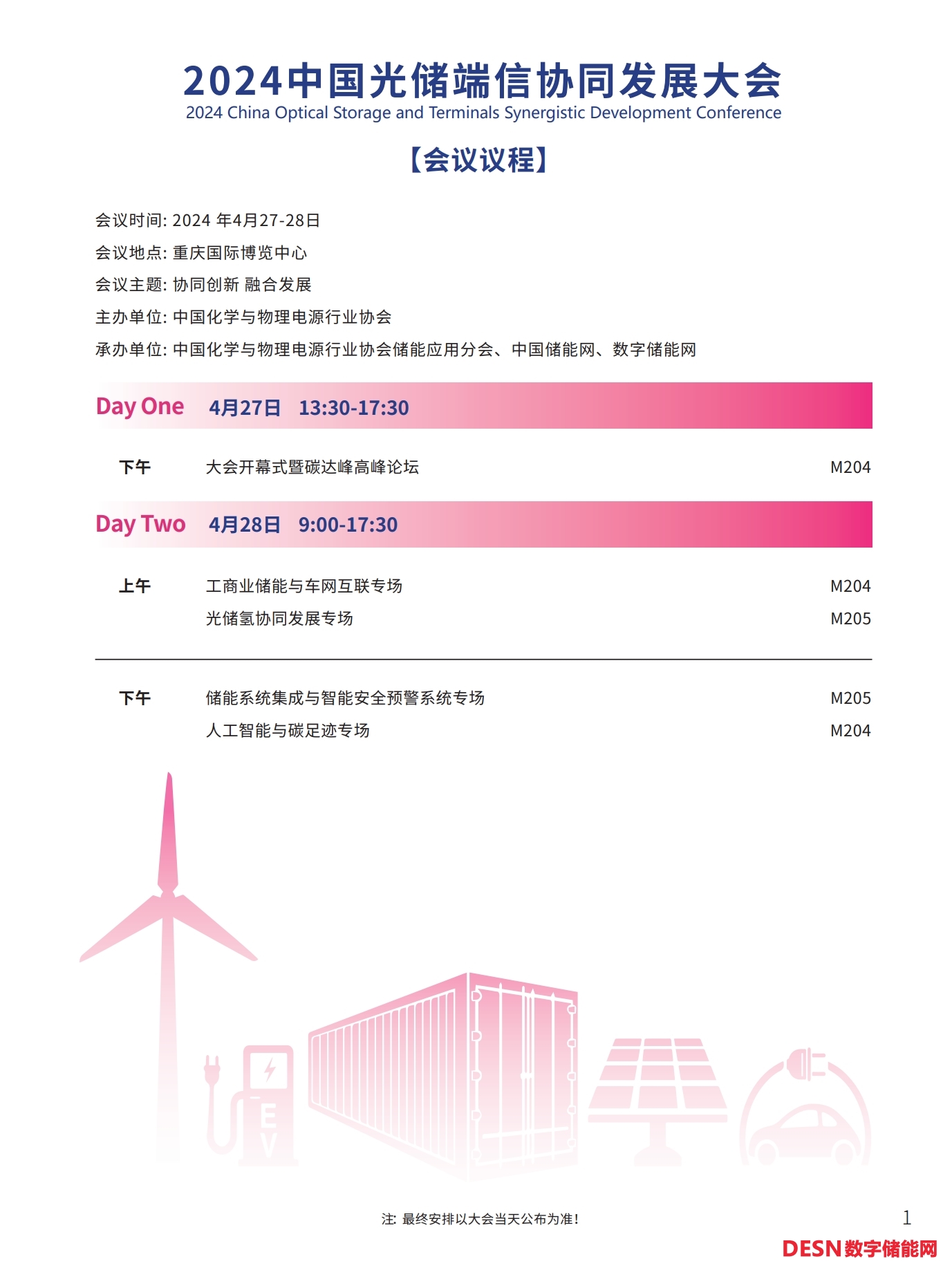 本屆大會(huì)將安排:大會(huì)開幕式暨碳達(dá)峰高峰論壇、工商業(yè)儲(chǔ)能與車網(wǎng)互聯(lián)專場、光儲(chǔ)氫協(xié)同發(fā)展專場、儲(chǔ)能系統(tǒng)集成與智能安全預(yù)警系統(tǒng)專場、人工智能與碳足跡專場等五個(gè)專場論壇。以下為本次大會(huì)主要議程(最終議程以活動(dòng)當(dāng)天公布為準(zhǔn))。