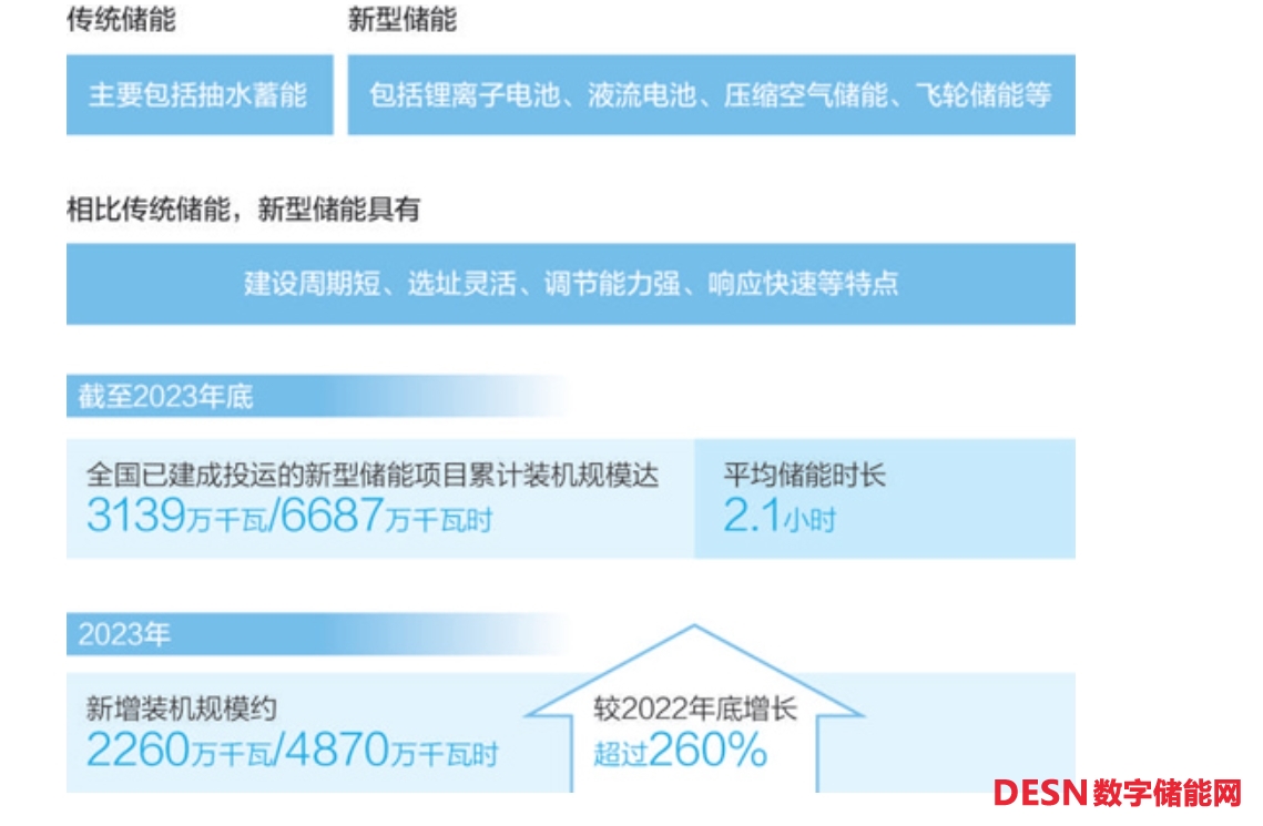 今年的《政府工作報(bào)告》提出,發(fā)展新型儲(chǔ)能。新型儲(chǔ)能是實(shí)現(xiàn)碳達(dá)峰碳中和目標(biāo)的重要支撐,包括鋰離子電池、液流電池、壓縮空氣儲(chǔ)能、飛輪儲(chǔ)能等,具有建設(shè)周期短、選址靈活、調(diào)節(jié)能力強(qiáng)、響應(yīng)快速等特點(diǎn)。國(guó)家能源局?jǐn)?shù)據(jù)顯示,截至2023年底,全國(guó)已經(jīng)建成投運(yùn)新型儲(chǔ)能項(xiàng)目累計(jì)裝機(jī)規(guī)模達(dá)3139萬(wàn)千瓦/6687萬(wàn)千瓦時(shí),平均儲(chǔ)能時(shí)長(zhǎng)2.1小時(shí);2023年新增裝機(jī)規(guī)模約2260萬(wàn)千瓦/4870萬(wàn)千瓦時(shí),較2022年底增長(zhǎng)超過260%。