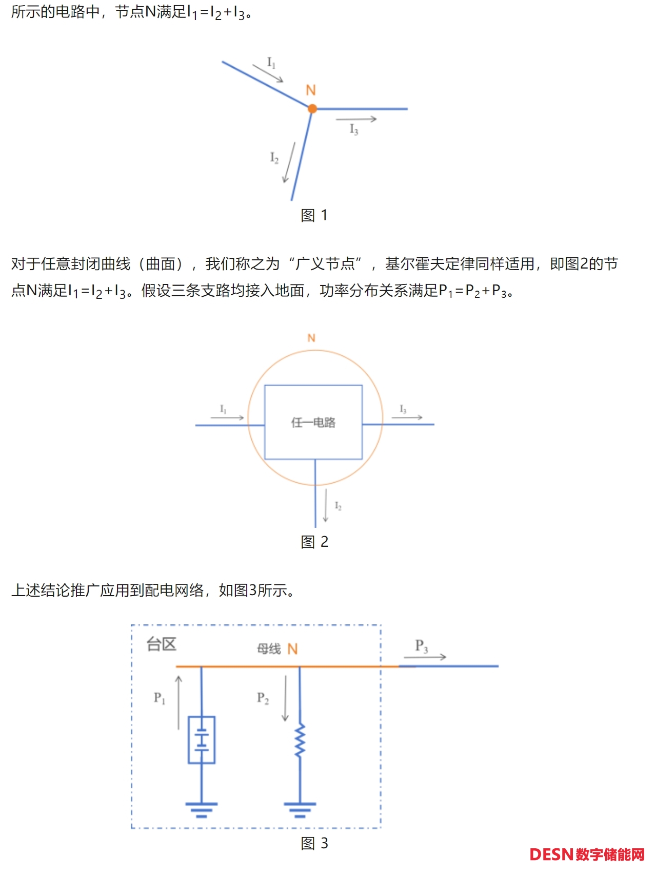 在熱議就近消納時(shí),我們往往忽視了一個(gè)基本概念,即就近消納是電力系統(tǒng)的物理特性。燈下黑的事實(shí),是分布式一直在就近消納,從來(lái)沒(méi)有一秒鐘例外。讓我們重溫電路課理論,以了解就近消納是如何實(shí)現(xiàn)的?;鶢柣舴虻谝欢桑址Q基爾霍夫電流定律,是電流的連續(xù)性在集總參數(shù)電路上的體現(xiàn),其物理背景為電荷守恒。根據(jù)定律,在任何直流或交流、線性或非線性的電路中,所有進(jìn)入某節(jié)點(diǎn)的電流總和等于所有離開(kāi)該節(jié)點(diǎn)的電流總和。因此,在圖1