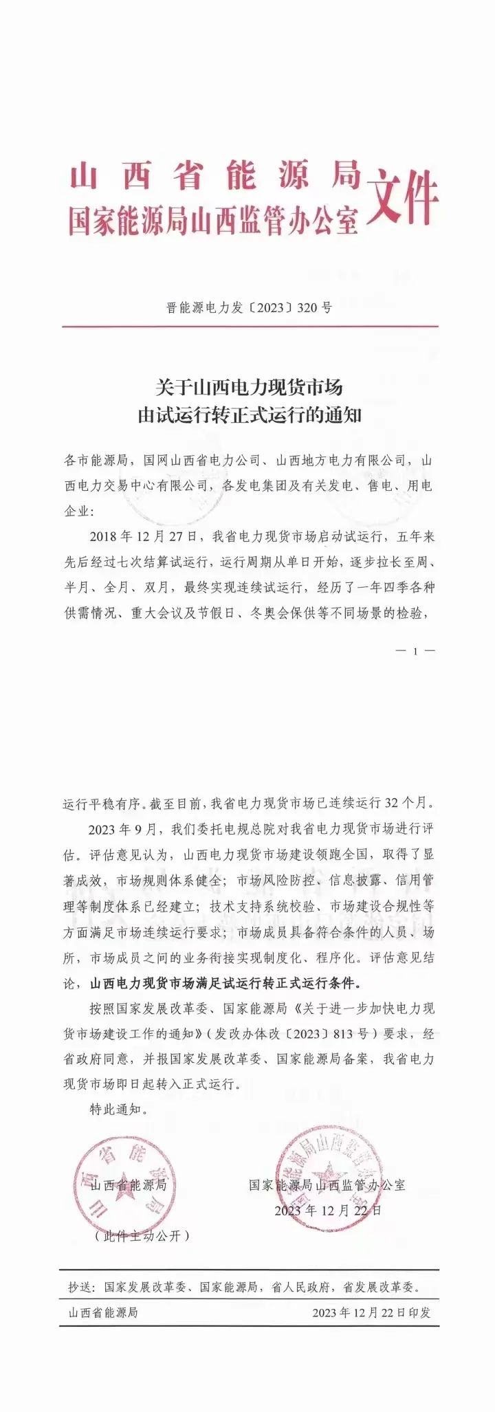 中國儲能網(wǎng)訊:12月22日,山西省能源局 山西能監(jiān)辦發(fā)布《關(guān)于山西電力現(xiàn)貨市場由試運行轉(zhuǎn)正式運行的通知》,山西省電力現(xiàn)貨市場即日起轉(zhuǎn)入正式運行!