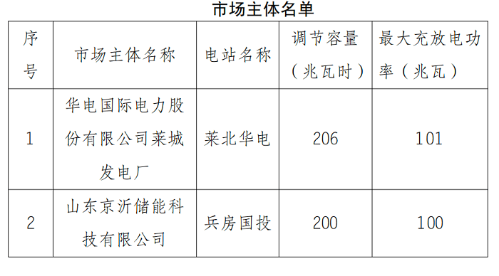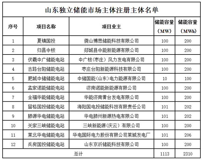 山東12家獨(dú)立儲(chǔ)能市場主體名單如下: