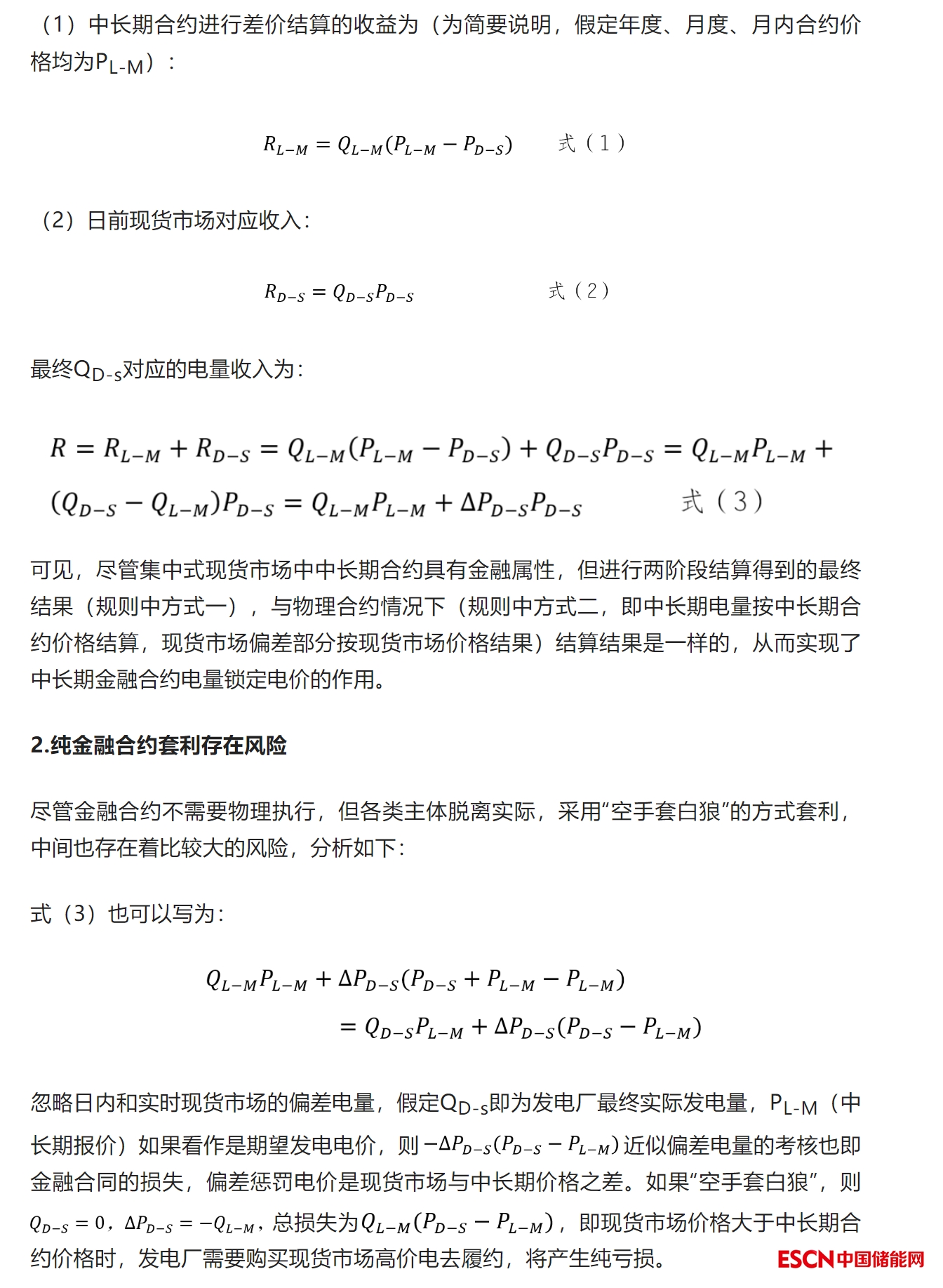 在集中式現貨市場中,由于采用了日前現貨市場全電量出清的方式,中長期成交電量不需要物理執(zhí)行,但產生的電量偏差根據現貨市場價格執(zhí)行。中長期合約是一種金融合約,采用差價結算,具有鎖定價格、對沖風險的作用。