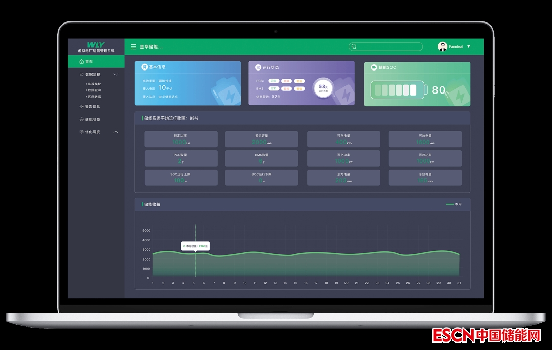 在此構架下,萬里揚能源公司結合公司開發(fā)的金華用戶側儲能示范項目開發(fā)了萬里揚虛擬電廠運營管理系統(tǒng),在完成底層基礎構架的前提下實現(xiàn)數(shù)據(jù)監(jiān)控、告警信息、系統(tǒng)收益、優(yōu)化調度等多個主要功能應用以及算法的研究開發(fā),并已完成管理系統(tǒng)的通信與聯(lián)調測試,待金華用戶側儲能示范項目工程完成后進入設備聯(lián)調,最終實現(xiàn)對儲能、屋頂光伏、用戶設備的聯(lián)合優(yōu)化控制。