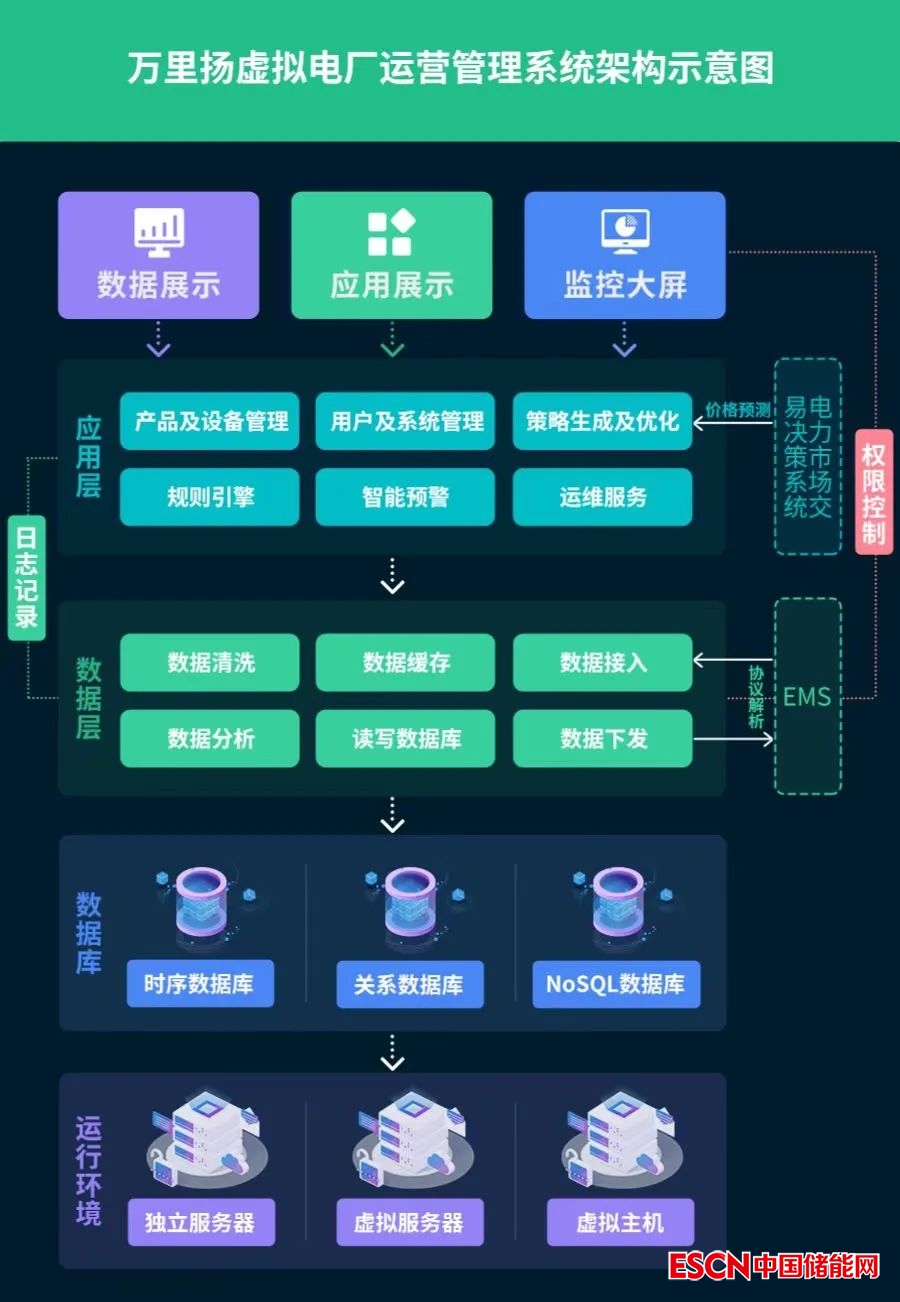 萬里揚能源公司針對上述虛擬電廠業(yè)務場景進行了全方位的剖析,構建了萬里揚虛擬電廠運營管理系統(tǒng)的基本架構,包括運行環(huán)境、數(shù)據(jù)庫、數(shù)據(jù)層、應用層、展示層等,業(yè)務場景涵蓋設備監(jiān)視、系統(tǒng)管理、策略優(yōu)化、運行控制、智能預警、運維服務等多個方面,形成了面向多類資源、多個站點、多種市場的虛擬電廠集中運營與控制。
