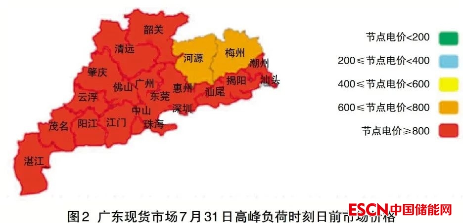 7月31日,廣東現(xiàn)貨市場發(fā)電側日前加權平均電價為0.7482元/千瓦時,廣東多數(shù)地區(qū)高峰時刻日前節(jié)點電價超800元/兆瓦時,如圖2所示。日前市場成交價最高為1.2299元/千瓦時。這個價格雖然較高,但是并沒有觸及1.5元/千瓦時的價格上限,更沒有反映稀缺電力的價值如用戶單位度電經濟增加值。
