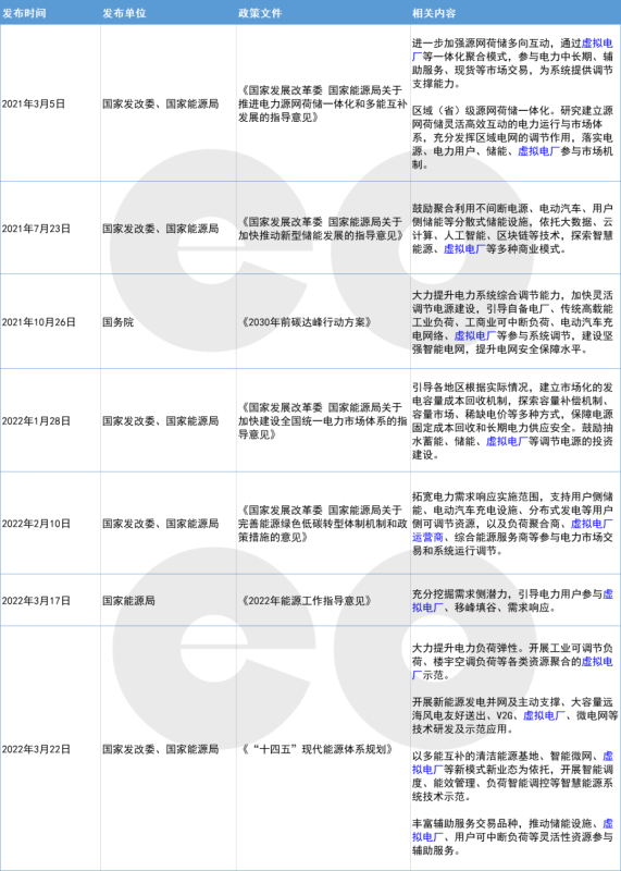 2022年3月國家發(fā)改委、國家能源局發(fā)布的《“十四五”現(xiàn)代能源體系規(guī)劃》四次提及“虛擬電廠”。2022年2月發(fā)布的《國家發(fā)展改革委 國家能源局關(guān)于完善能源綠色低碳轉(zhuǎn)型體制機(jī)制和政策措施的意見》提出,拓寬電力需求響應(yīng)實(shí)施范圍,支持虛擬電廠運(yùn)營商等參與電力市場交易和系統(tǒng)運(yùn)行調(diào)節(jié)。此前,2021年10月,國務(wù)院發(fā)布的《2030年前碳達(dá)峰行動(dòng)方案》,提出加快靈活調(diào)節(jié)電源建設(shè),引導(dǎo)虛擬電廠等多種資源參與系統(tǒng)調(diào)節(jié)。