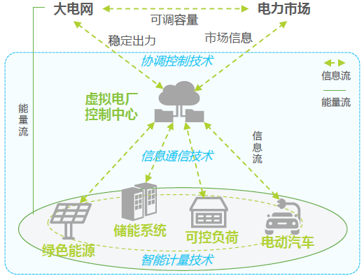 虛擬電廠(Virtual Power Plants, VPP)將不同空間的可調(diào)節(jié)(可中斷)負(fù)荷、儲(chǔ)能、微電網(wǎng)、電動(dòng)汽車、分布式電源等一種或多種資源聚合起來(lái),實(shí)現(xiàn)自主協(xié)調(diào)優(yōu)化控制,參與電力系統(tǒng)運(yùn)行和電力市場(chǎng)交易。虛擬電廠新業(yè)態(tài)既可作為“正電廠”向系統(tǒng)供電調(diào)峰,又可作為“負(fù)電廠”加大負(fù)荷消納配合系統(tǒng)填谷。