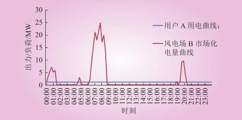 假設電網(wǎng)中有一個市場用戶A,年用電量1000萬kW·h,需要使用100%綠電。用戶A與風電場B簽訂年用電量1000萬kW·h的年購電合同。風電場B裝機容量50 MW,年利用小時數(shù)2000 h,保障利用小時數(shù)1600 h,即8000萬kW·h為計劃電量,2000萬kW·h為市場電量,風電場B充分考慮預測準確性,在市場電量中僅簽訂1000萬kW·h中長期合同。