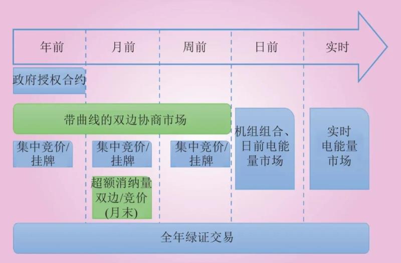 交易品種設計綜合考慮現(xiàn)貨市場和現(xiàn)貨環(huán)境下的中長期市場。新能源交易品種包括政府授權合約、電力、超額消納量,以及綠證。