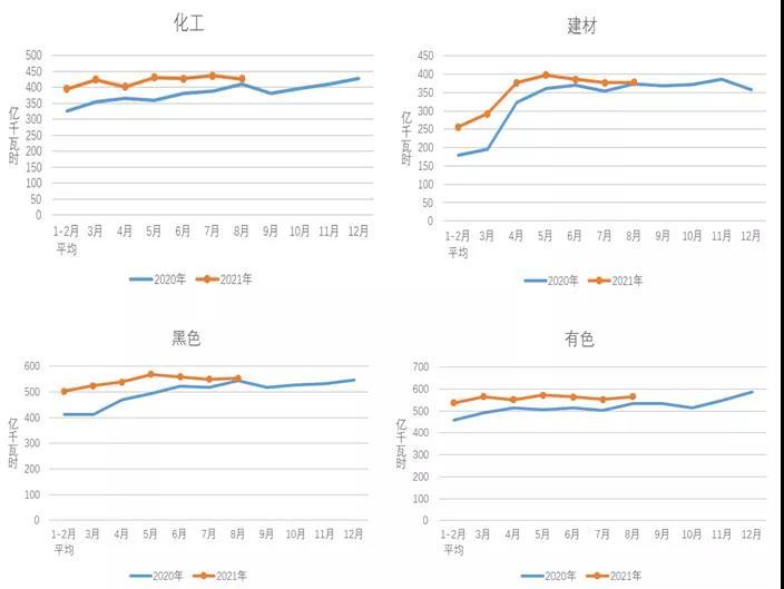 1-8月,化工行業(yè)用電量3338億千瓦時(shí),同比增長(zhǎng)9.9%,增速比上年同期提高11.2個(gè)百分點(diǎn);建材行業(yè)用電量2721億千瓦時(shí),同比增長(zhǎng)14.5%,增速比上年同期提高14.9個(gè)百分點(diǎn);黑色金屬冶煉行業(yè)用電量4302億千瓦時(shí),同比增長(zhǎng)12.6%,增速比上年同期提高11.3個(gè)百分點(diǎn);有色金屬冶煉行業(yè)用電量4446億千瓦時(shí),同比增長(zhǎng)8.2%,增速比上年同期提高5.4個(gè)百分點(diǎn)。
