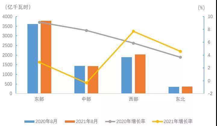 8月份,東、中、西部和東北地區(qū)全社會(huì)用電量增速分別為2.9%、-0.3%、7.7%和4.6%。