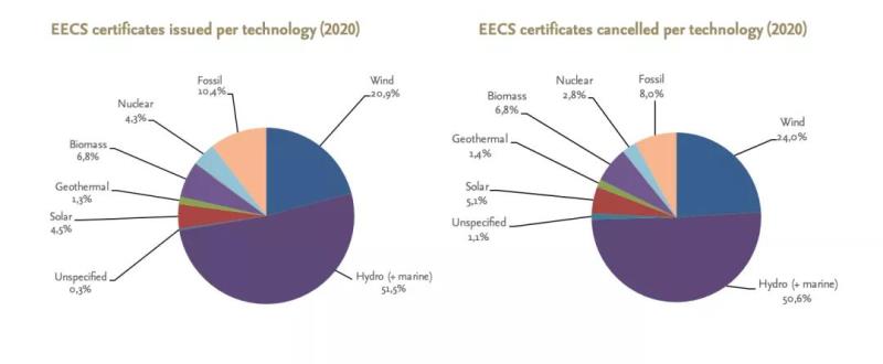 歐洲的GO機制是在歐洲能源證書標(biāo)準(zhǔn)(EECS)體系下對電力來源進行擔(dān)保,而不同國家認(rèn)可的品種不一,水電、風(fēng)電、光伏、生物質(zhì)發(fā)電是主要來源,有的國家也認(rèn)可核電和熱電聯(lián)產(chǎn)的燃?xì)獍l(fā)電。