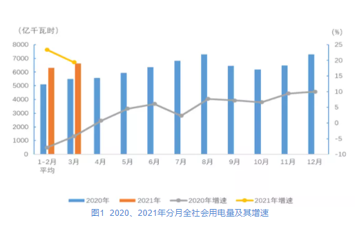 圖1 2020、2021年分月全社會(huì)用電量及其增速