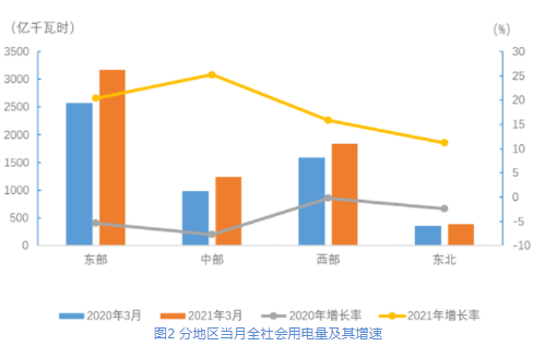 3月份,東、中、西部和東北地區(qū)全社會(huì)用電量增速分別為20.4%、25.3%、15.8%和11.2%。