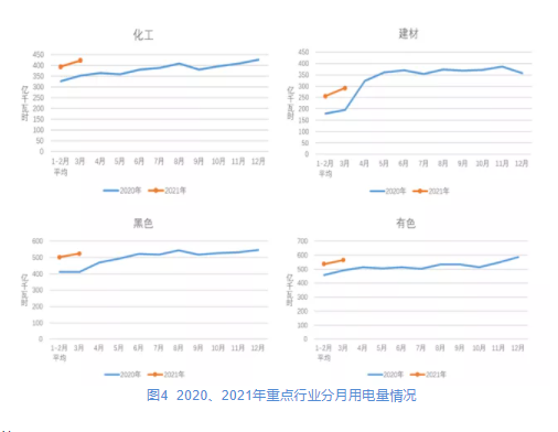 圖4 2020、2021年重點(diǎn)行業(yè)分月用電量情況