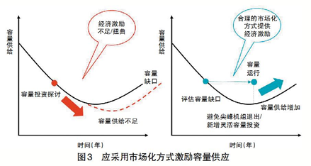 我國當(dāng)前處于容量市場起步階段,多地對于容量市場的構(gòu)建進(jìn)行了有益的探索,同時也暴露出一些問題。山東省將容量成本按照政府制定的容量補(bǔ)償價格從用戶側(cè)收取,參與電力現(xiàn)貨市場的煤電機(jī)組試行容量補(bǔ)償電價,標(biāo)準(zhǔn)暫定為0.0991元/千瓦時(含稅),每月按機(jī)組的折算容量進(jìn)行分配,已完成折舊的機(jī)組可獲得80%的補(bǔ)償,未完成折舊的機(jī)組可獲全部補(bǔ)償,檢修、非停等不可用容量要被扣除。容量補(bǔ)償能緩解一定經(jīng)營壓力,但這種贖買的方式無疑是有缺陷的,管制的靈活性滯后于市場調(diào)節(jié),政府預(yù)先制定的容量補(bǔ)償價格未必與市場行情相符,定價過高會增加用戶成本,定價過低則無法對發(fā)電商投資起到激勵作用,政策的變化也會使得市場在振奮和蕭條間來回波動,不利于市場的穩(wěn)定建設(shè)。因此,為了更好地激發(fā)容量市場活力,應(yīng)采用市場化的方式反映容量的價值,來避免系統(tǒng)需要的機(jī)組因為經(jīng)營虧損退出和激勵新的靈活性容量投資進(jìn)入(見圖3)。