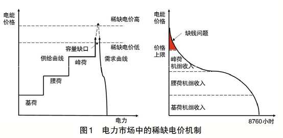 能量補(bǔ)償是指電力系統(tǒng)可靠性和電源投資水平由市場參與者根據(jù)電能量市場的價格信號而非規(guī)定的容量要求來確定,允許發(fā)電商通過尖峰時刻產(chǎn)生的稀缺電價回收成本并創(chuàng)造收益。理想的電力市場狀態(tài)下,需求對價格有著及時的反應(yīng),供應(yīng)不足時價格就會上漲,直到有足夠的容量來滿足負(fù)荷需求,且滿足負(fù)荷需求的所有容量都按照尖峰時刻的稀缺電價進(jìn)行結(jié)算(見圖1左)。理論上講,稀缺電價機(jī)制需要的監(jiān)管干預(yù)措施是最少的,其市場設(shè)計也簡單透明,這樣所有的容量不論有沒有被使用,其意義是一樣的,都是為了保證電力系統(tǒng)的可靠性和長期穩(wěn)定性而存在,需要投資建設(shè)足夠的容量來滿足尖峰負(fù)荷。