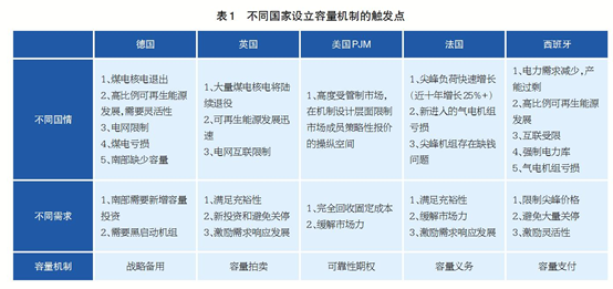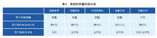 在全球多個運(yùn)營的電力市場中,為確保發(fā)電容量充裕性采用的方法各不相同,并仍處于改進(jìn)完善甚至重新構(gòu)建的過程中。不同國家基于本國不同國情、不同需求(見表1),選擇不同的容量機(jī)制,典型的包括戰(zhàn)略備用、容量拍賣、可靠性期權(quán)、具有可交換證書的容量義務(wù)和容量支付(見表2)。