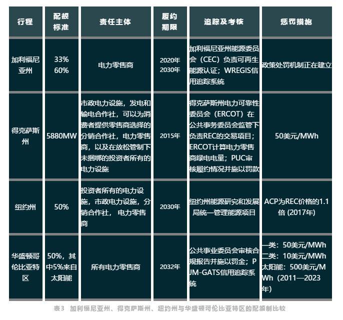 我們選取了加利福尼亞州、得克薩斯州、紐約州和華盛頓哥倫比亞特區(qū),對這幾個地區(qū)的配額制機制進行了總結和比較。這四個地區(qū)的配額制各有特色。加利福尼亞州由于管制市場與放松管制市場并存,配額制機制較為復雜;得克薩斯州的配額制具有周密的制度設置和配套的支持措施,如稅收優(yōu)惠和財政補貼,因此被認為是美國配額制的模板;紐約州是唯一一個采用政府統(tǒng)購模式實行配額制的州,并且于2016年起實施了新的清潔能源配額制;華盛頓哥倫比亞特區(qū)除總體的配額之外,還對太陽能發(fā)電的比重設定了目標。