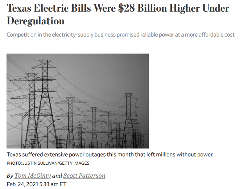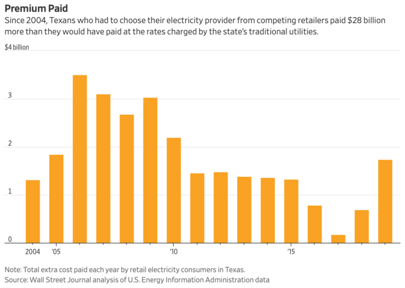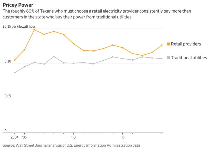 據(jù)《華爾街日?qǐng)?bào)》對(duì)聯(lián)邦能源信息管理局(Federal Energy Information Administration)數(shù)據(jù)的分析,自2004年以來(lái),德克薩斯州從零售商購(gòu)電的用戶支付的電費(fèi)相比向傳統(tǒng)公用事業(yè)公司多付280億美元。這次的停電危機(jī)期間,德州電力市場(chǎng)批發(fā)價(jià)格連續(xù)幾天飆升至每兆瓦時(shí)9000美元的市場(chǎng)價(jià)格上限,此后從零售電力公司選擇可變費(fèi)率供電計(jì)劃的用戶收到了天價(jià)賬單。