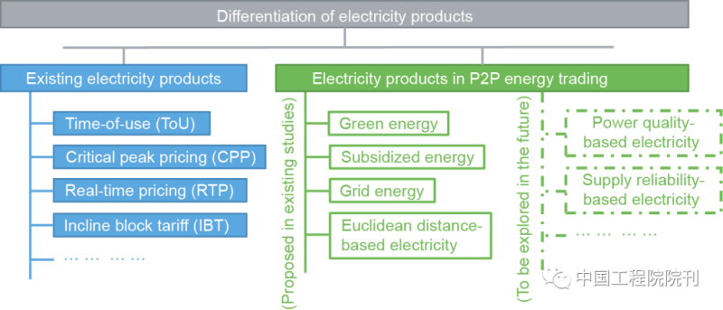 電力產(chǎn)品的異質(zhì)化是端對(duì)端能源交易很有潛力的一個(gè)發(fā)展方向。現(xiàn)有研究和實(shí)踐主要從時(shí)間、距離和類(lèi)型(如綠色電力、補(bǔ)貼電力和電網(wǎng)電力等不同類(lèi)型)三方面對(duì)電力產(chǎn)品進(jìn)行區(qū)別。未來(lái)可以對(duì)電力產(chǎn)品進(jìn)行進(jìn)一步的異質(zhì)化,如基于電能質(zhì)量的異質(zhì)化、基于供電可靠性的異質(zhì)化等。