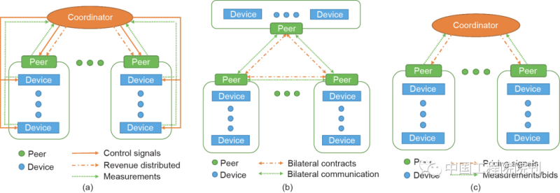分布式市場(chǎng)是一種介于集中式市場(chǎng)和分散式市場(chǎng)之間的市場(chǎng)機(jī)制。與集中式市場(chǎng)的協(xié)調(diào)者直接控制用戶(hù)的能源輸入/輸出量或直接控制用戶(hù)設(shè)備不同,分布式市場(chǎng)的協(xié)調(diào)者往往通過(guò)價(jià)格信號(hào)間接影響用戶(hù)的行為。與完全分散式市場(chǎng)相比(如與文獻(xiàn)相比),分布式市場(chǎng)具有一個(gè)市場(chǎng)協(xié)調(diào)者,因此用戶(hù)的用電行為可以得到更好的協(xié)調(diào)。與集中式市場(chǎng)相比(如與文獻(xiàn)相比),分布式市場(chǎng)往往需要更少的量測(cè)數(shù)據(jù),并且也不直接控制用戶(hù)設(shè)備,因此可以更好地保障用戶(hù)的隱私和自治性??傊?,分布式市場(chǎng)結(jié)合了集中式市場(chǎng)和分散式市場(chǎng)的特點(diǎn),是一種居中的解決方法。