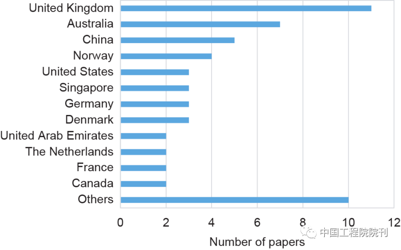 圖2展示了各個(gè)國(guó)家相關(guān)論文的發(fā)表數(shù)量。英國(guó)是目前發(fā)表端對(duì)端能源交易相關(guān)論文最多的國(guó)家,而歐盟國(guó)家作為一個(gè)整體貢獻(xiàn)了超過(guò)全球論文總數(shù)55%的論文,顯著超過(guò)全球其他國(guó)家和地區(qū)。澳大利亞產(chǎn)出的相關(guān)論文排名全球第二。此外,亞洲國(guó)家(包括中國(guó)、新加坡和日本)和北美國(guó)家(包括美國(guó)和加拿大)也產(chǎn)出了許多相關(guān)論文,分別為9篇和5篇。