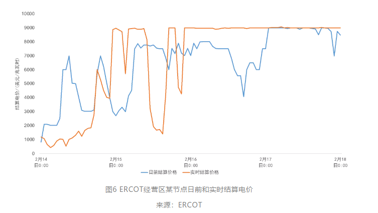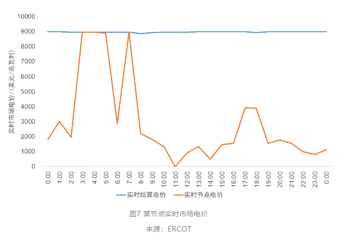 在上述因素影響下,除發(fā)生大面積停電事故外,更帶來燃料價格與電力價格的全面快速上漲。ECROT披露的信息顯示,天然氣價格已超過180美金/mmbtu,導致市場價格帽LCAP (Low System Wide Offer Cap) 失效,日前和實時市場在出清階段已突破9000美元/MW的市場限價,必須強制使用HCAP(High System-Wide Offer Cap)以避免現(xiàn)貨市場結(jié)算價格超出9000美元/MW的限價,如圖6所示。