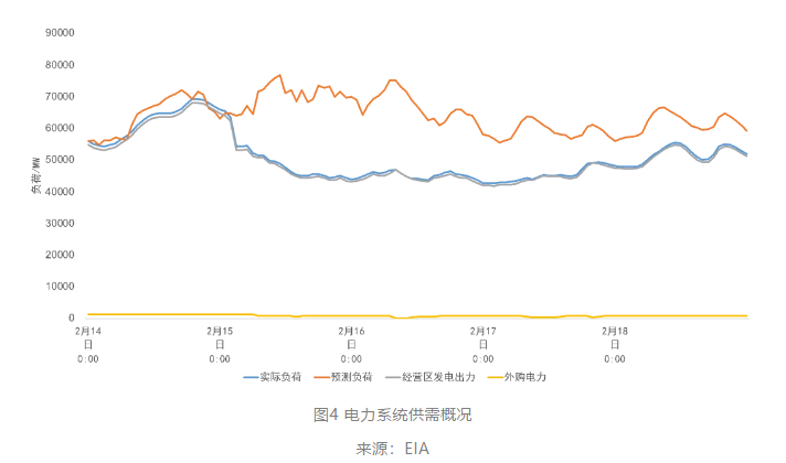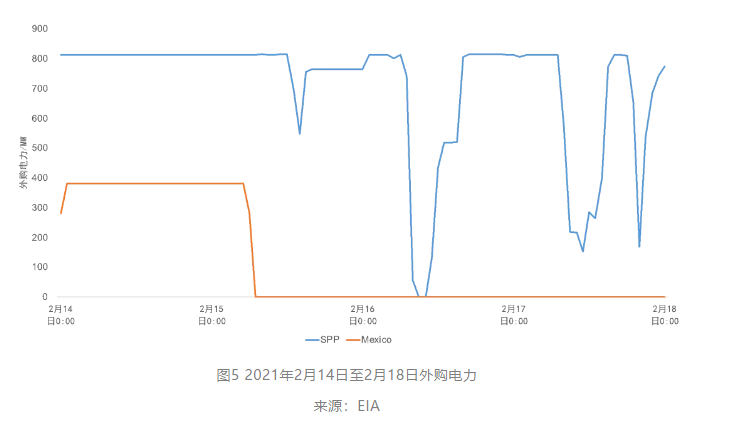 ERCOT與北美其他地區(qū)互聯(lián)程度有限,其中兩條共計82萬千瓦的聯(lián)絡線與SPP相連,三條共計43萬千瓦的聯(lián)絡線與墨西哥聯(lián)邦電力委員會相連,2019年凈購入電力約5億千瓦時。因此,當ERCOT發(fā)生供應緊缺時,難以通過跨區(qū)購電以保障供給,進一步加劇供需矛盾,如圖5所示。