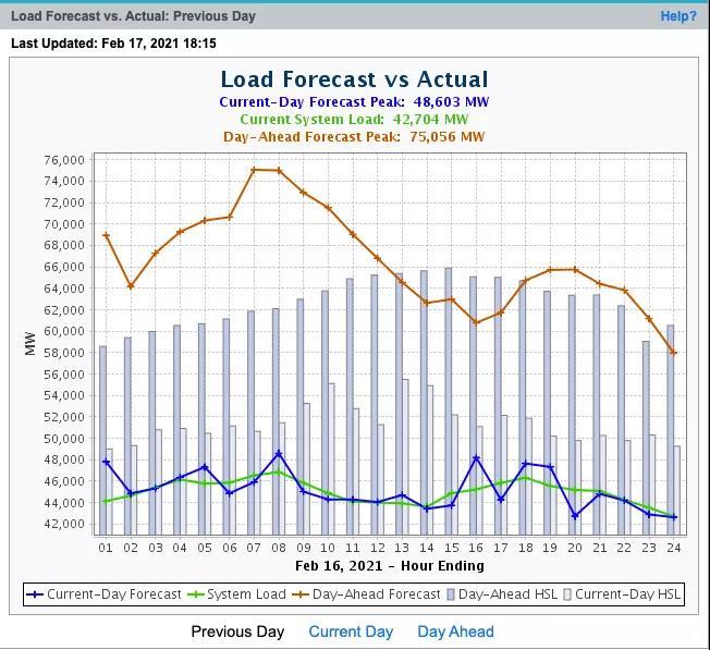 得州處于多氣候帶交匯地區(qū),南部地區(qū)冬季溫暖。以州首府奧斯汀為例,本次停電期間創(chuàng)近20年來2月中旬平均氣溫最低的紀錄,如圖2所示。由于當?shù)囟静膳问街饕獮殡姽┡?,異常寒冷帶來的用電負荷激增遠超預期。根據(jù)ERCOT測算,異常低溫造成用電負荷激增,預測用電負荷將超過7500萬千瓦,創(chuàng)冬季用電負荷新高,如圖3所示。