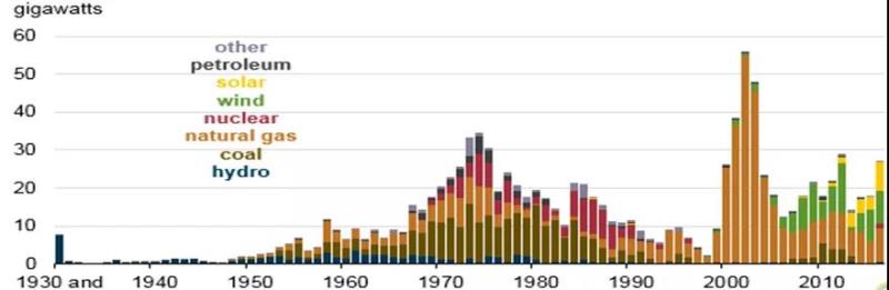 圖2 美國新增各類型機(jī)組裝機(jī)容量變化趨勢圖