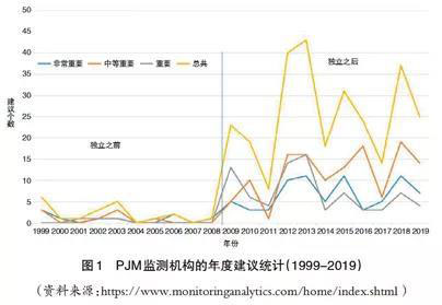 交易和調(diào)度機(jī)構(gòu)不能作為“第三方”監(jiān)測機(jī)構(gòu)來完成市場監(jiān)測的核心原因是,交易和調(diào)度機(jī)構(gòu)是運行規(guī)則和調(diào)度程序的制定者和維護(hù)者,通常會對任何批評指控比較敏感,有意識或無意識地維護(hù)現(xiàn)有的規(guī)則設(shè)計,正所謂“球員兼裁判”難以“自裁自醫(yī)”也。為了降低對規(guī)則設(shè)計的批評,交易和調(diào)度中心可能會對內(nèi)部監(jiān)測人員施加壓力,造成市場監(jiān)測失靈。以PJM監(jiān)測(圖1)為例,圖中“非常重要”是指監(jiān)測機(jī)構(gòu)認(rèn)為非常重要的建議(其他類推),在監(jiān)測機(jī)構(gòu)屬于PJM內(nèi)部部門的1999-2008,監(jiān)測機(jī)構(gòu)平均一年只有2個建議,許多年份甚至為零。當(dāng)該監(jiān)測機(jī)構(gòu)從2009年起變成獨立于PJM的機(jī)構(gòu)后,建議馬上增加到平均每年26個??梢奝JM管理層對內(nèi)部監(jiān)測部門有著很大的負(fù)面影響。值得強(qiáng)調(diào)的是,絕大部分PJM監(jiān)測機(jī)構(gòu)的建議都與市場規(guī)則有關(guān)。