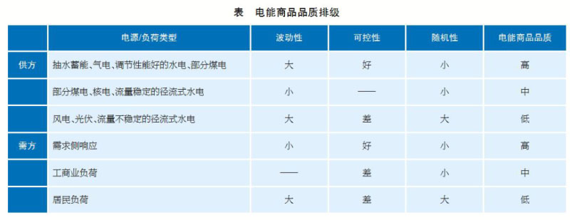 由于電能難以大量儲(chǔ)存,發(fā)用功率需要實(shí)時(shí)平衡,從對電力系統(tǒng)調(diào)度運(yùn)行和功率平衡的影響,筆者認(rèn)為電能商品品質(zhì)應(yīng)從(波動(dòng)性、可控性、隨機(jī)性)3個(gè)維度進(jìn)行衡量(見表)。其中波動(dòng)性指功率相對于自身容量的變化幅度;可控性指將功率在一定范圍內(nèi)自由調(diào)節(jié)的難易程度;隨機(jī)性與可控性有一定的關(guān)聯(lián),隨機(jī)性大的電源或負(fù)荷一定難于控制,而隨機(jī)性小的電源或負(fù)荷可能易控(可靈活調(diào)節(jié)的資源),也可能難控(功率相對固定的資源)。對當(dāng)前各類常見供方(電廠)所生產(chǎn)和需方(負(fù)荷)所消費(fèi)的電能商品品質(zhì)可以給出表中所示的排級(jí)。注意這里是對電能商品的品質(zhì)進(jìn)行排級(jí),而非給電源或負(fù)荷“貼標(biāo)簽”,僅按一般情況依照電能商品品質(zhì)高低對電源和負(fù)荷進(jìn)行大致分類,而具體情況需要具體分析。例如,如果品質(zhì)一般的煤電經(jīng)過靈活性改造,可升級(jí)為高品質(zhì)的調(diào)峰電源。需要說明的是,電能商品品質(zhì)是從保證電力系統(tǒng)發(fā)用功率平衡的角度來定義的,因此對于電能商品的供方(生產(chǎn)者)和需方(消費(fèi)者),商品品質(zhì)的價(jià)值內(nèi)涵是不同的。從定價(jià)原則來講,對于供方,電能商品品質(zhì)越高,定價(jià)越高;對于需方,電能商品品質(zhì)越高,定價(jià)越低(即價(jià)格越優(yōu)惠),甚至可以享受負(fù)電價(jià)。也就是說,供方所生產(chǎn)的低品質(zhì)電能商品(如風(fēng)電)可以較低價(jià)提供需方的高品質(zhì)電能商品消費(fèi)(如需求側(cè)響應(yīng)),反之亦然。
