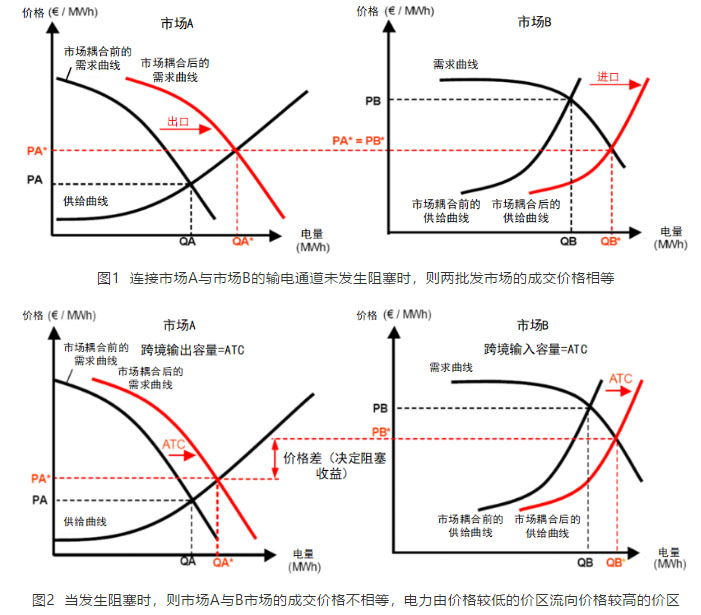 對(duì)于跨國(guó)輸電通道的輸電阻塞,一般由輸電容量顯式拍賣和輸電容量隱式拍賣兩種方式進(jìn)行處理。顯式拍賣適用于跨境雙邊電力交易;隱式拍賣主要適用于日前市場(chǎng)耦合。